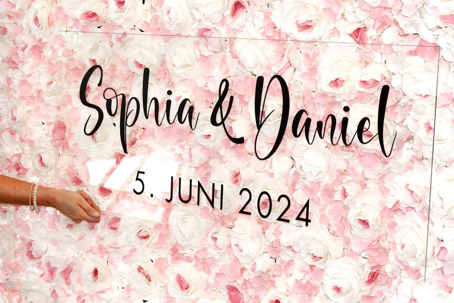 Gerne personalisieren wir die Blumenwand nach euren Wünschen und dem Anlass entsprechend mit einem Acrylschild (100 x 40cm). Wir beraten euch gerne.